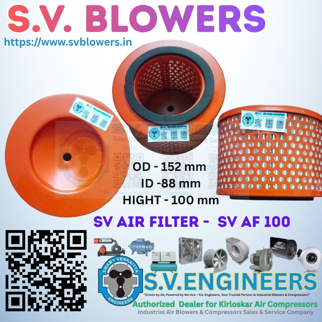 The SV AF 100 Air Filter from S.V. Engineers is a high-performance filtration solution specially designed for Twin Lobe and Tri Lobe Roots Air Blowers. It ensures clean air intake, protects blower components, and enhances operational efficiency.