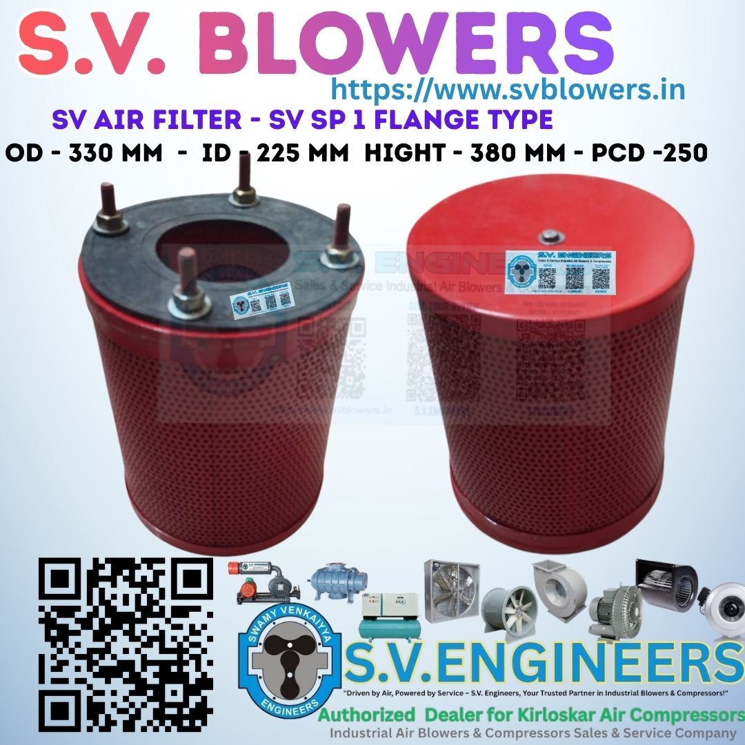 The SV SP 1 Flange Type Air Filter is a heavy-duty industrial air intake filter specially designed for Twin Lobe and Tri Lobe Roots Air Blowers. This model features a flange mounting design, ensuring secure installation and leak-proof performance in high-capacity blower systems.